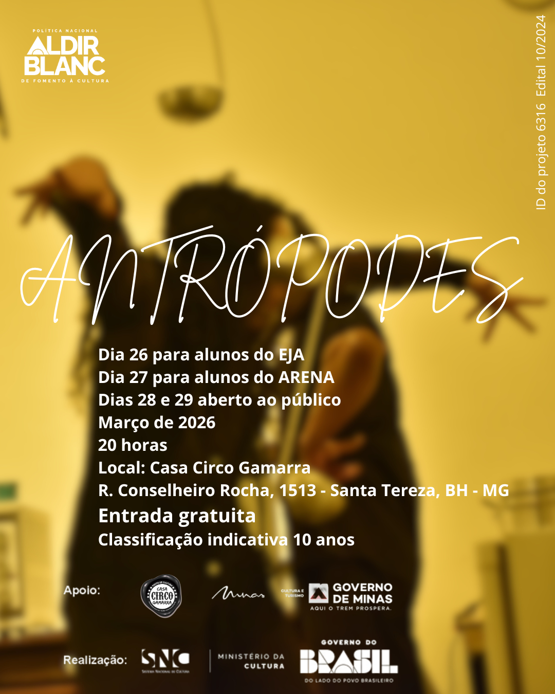 O espetáculo de dança-teatro “Antrópodes” volta em cartaz, desta vez ocupando a icônica Casa Circo Gamarra, no bairro Santa Tereza em Belo Horizonte. São poucos lugares disponíveis! Vamos disponibilizar o primeiro lote de ingressos pelo sympla e o segundo lote será distribuído presencialmente no local e na hora da apresentação.