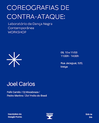 Tendo como base os estudos de corpo em diáspora, o trânsito, as manifestações negras brasileiras e a dança contemporânea, esse workshop é um trabalho prático-teórico que surge a partir de pesquisas afro-referenciadas realizadas pelo coreógrafo, dançarino e ator Joel Carlos em parceria com a multi-percussionista Fefê Camilo e o Dj Mozabraza nas musicalidades e os artistas Pedro Martins e Zizi Yndio do Brasil na visualidades, fotografia, vídeo e comunicação.