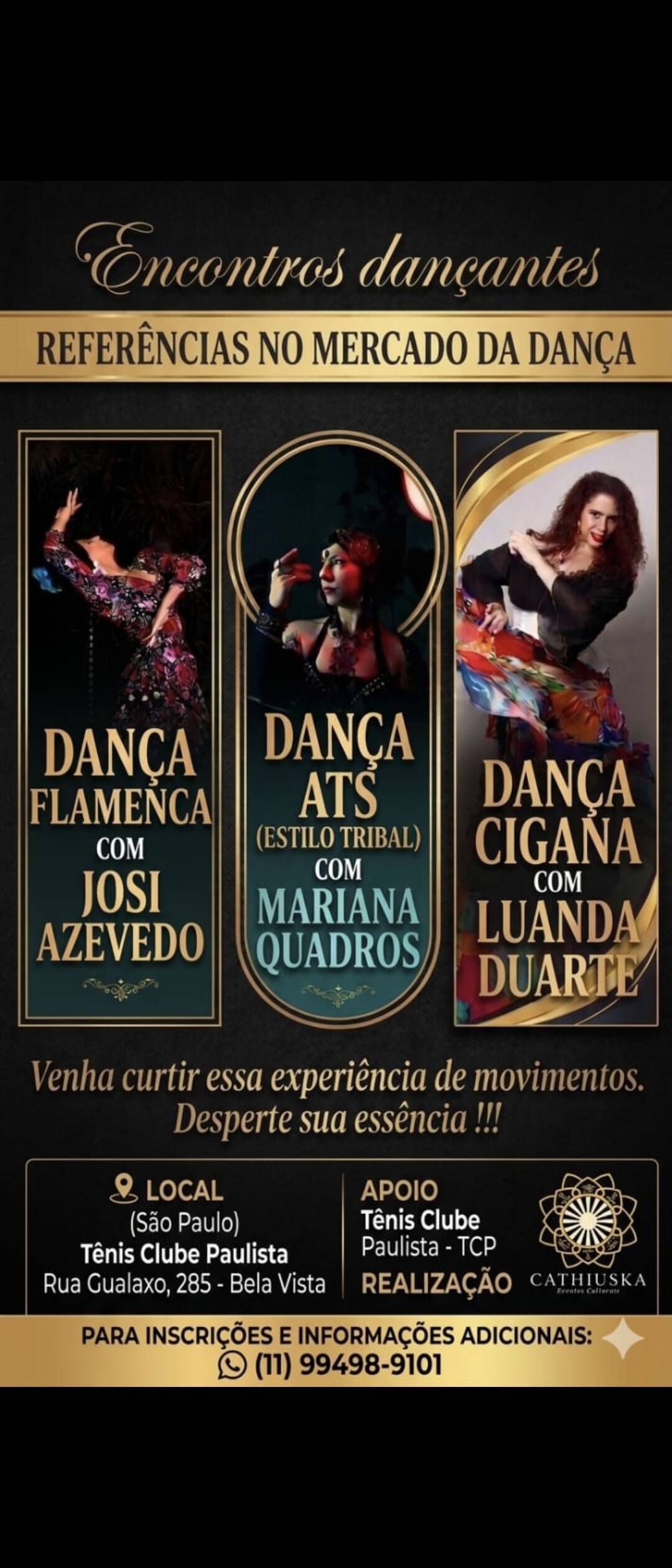 Venha fazer parte dos nossos encontros da dança. Imperdível a experiência qie sera realizada no TCP Tênis Clube Paulista a partir de 11/04/2026, sábados às 10h (2h aulas mensais com cada artista):