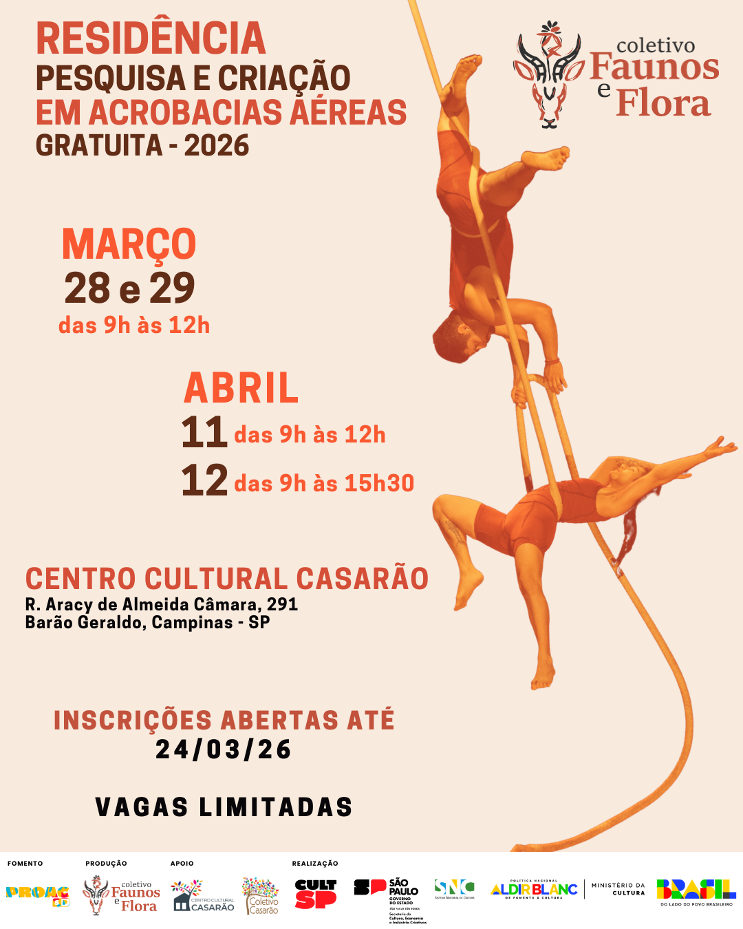 O Coletivo Faunos e Flora, grupo de pesquisa e criação em circo contemporâneo e acrobacias aéreas de Campinas-SP, está com inscrições abertas para “Residência – Pesquisa e Criação em Acrobacias Aéreas”, atividade é gratuita com 5 encontros e soma o total de 14 horas. A residência acontece em março nos dias 28 e 29 das 9h às 12h, e em abril no dia 11/04 das 9h às 12h e 12/04 das 9h às 15h30. Os encontros acontecerão em Barão Geraldo no Centro Cultural Casarão e serão ministrados pelos integrantes do coletivo, Fernando Basilio, Manuela Carvalho e Rômulo Celestino. A atividade faz parte das ações do projeto do Coletivo contemplado pelo fomento do ProAc e PNAB 2024.