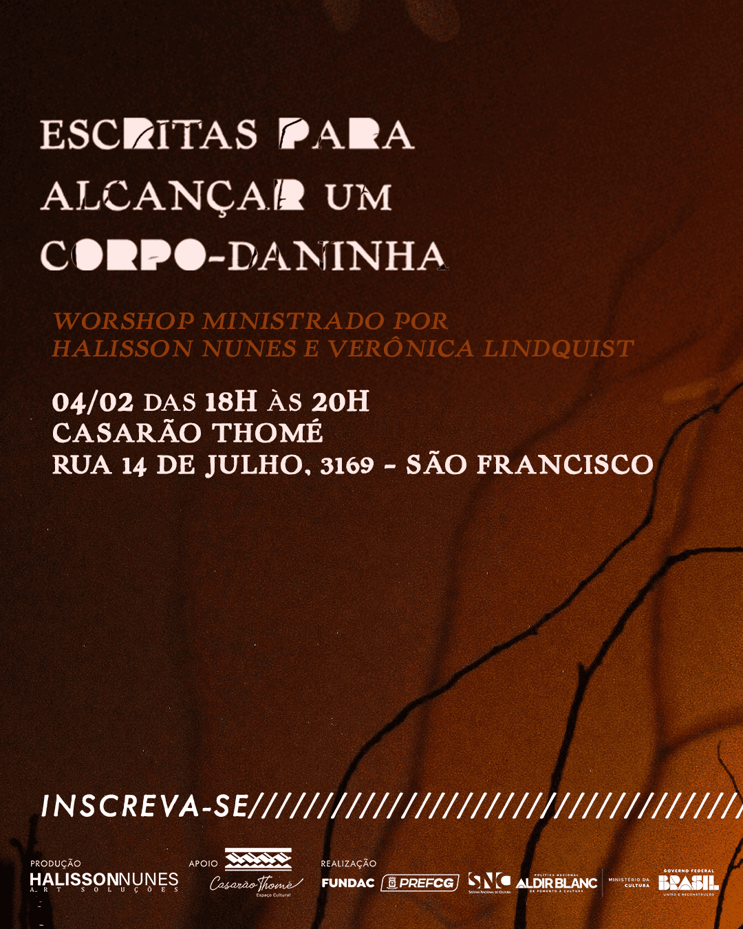 Escrita é corpo e corpo é possibilidade mutante. O workshop Escritas para Alcançar um Corpo-Daninha busca investigar os múltiplos caminhos para a criação partindo da escrita performática, para que inspire composições coreográficas que estimulem a criação de narrativas sensoriais para a construção do corpo-daninha atravessado pela intrusão de memória, de encontros, desencontros, simbioses e metamorfoses entre natureza e cultura.