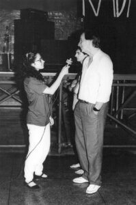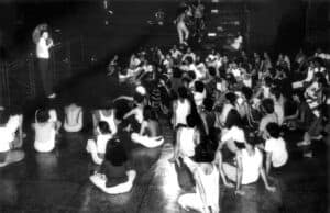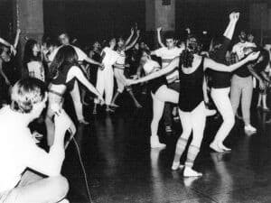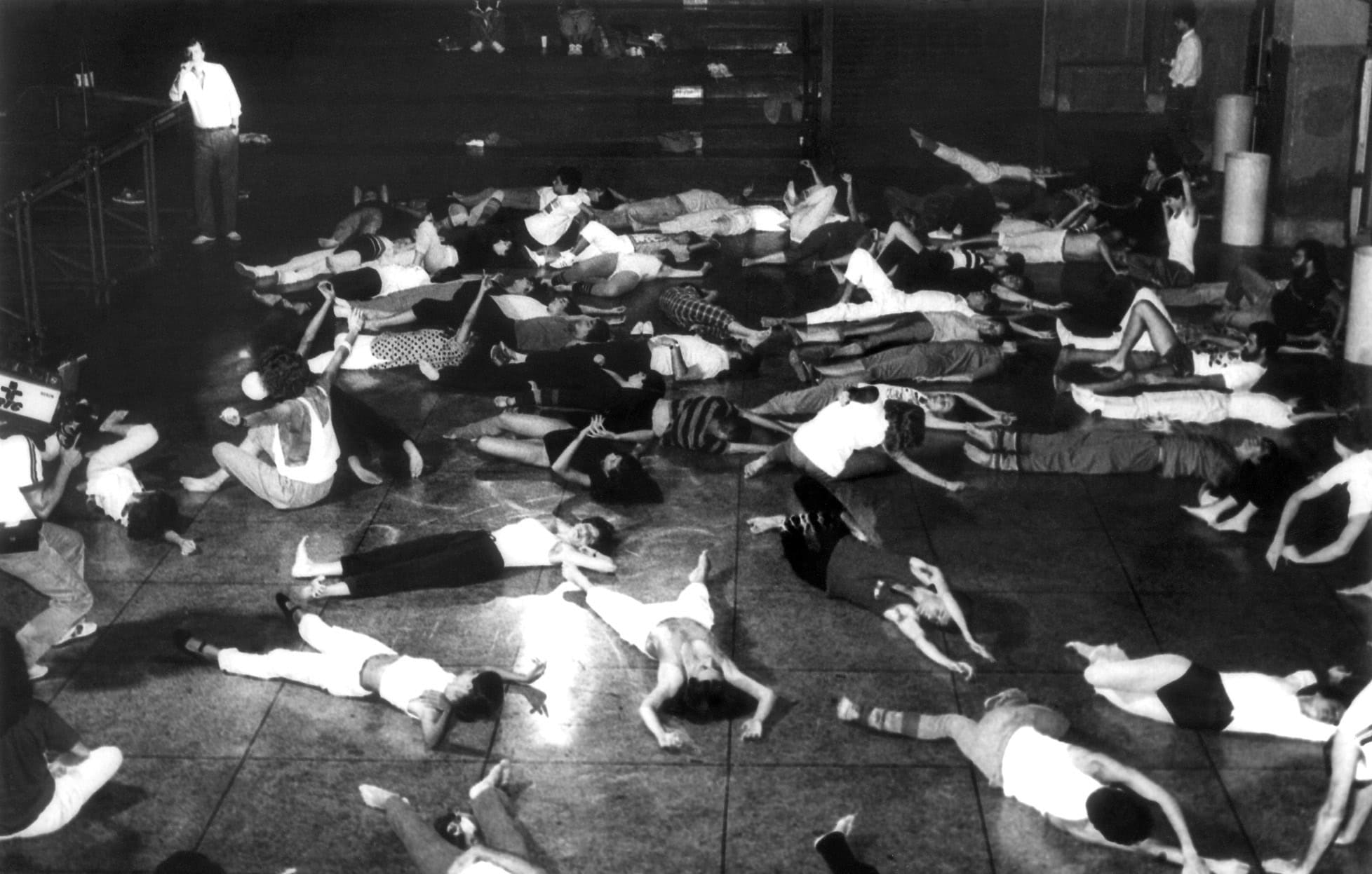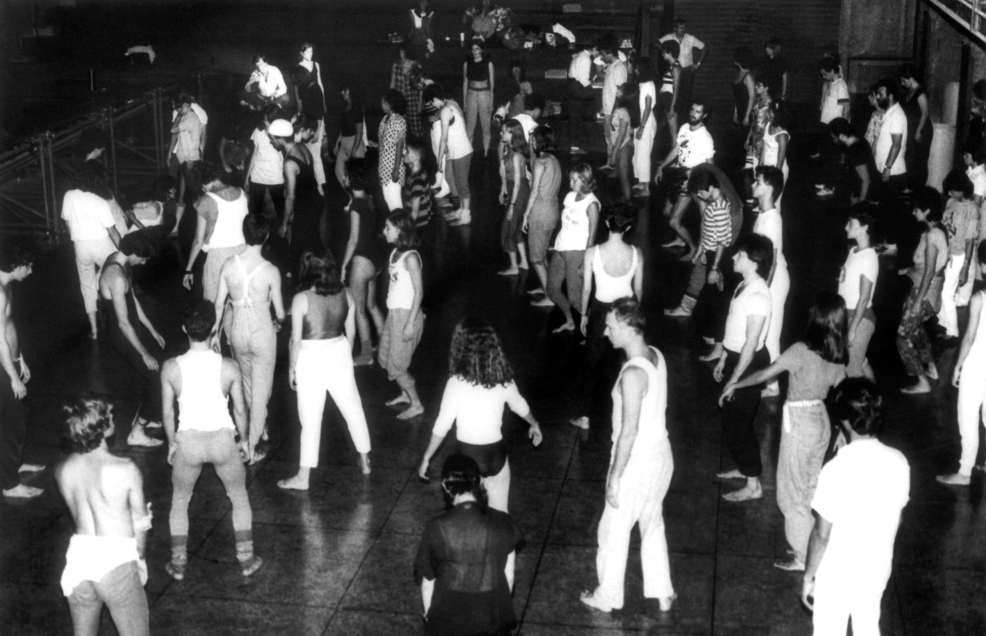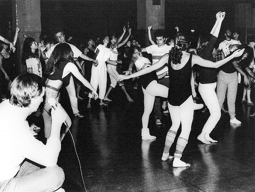 Imagens de Klauss Vianna ministrando uma aula aberta para diversos alunos na Discoteca Radar Tan Tan, localizada no bairro do Bom Retiro, em São Paulo. Em uma das fotos, a pesquisadora e crítica de dança Helena Katz entrevista Klauss Vianna e o bailarino Duda Costilhes.