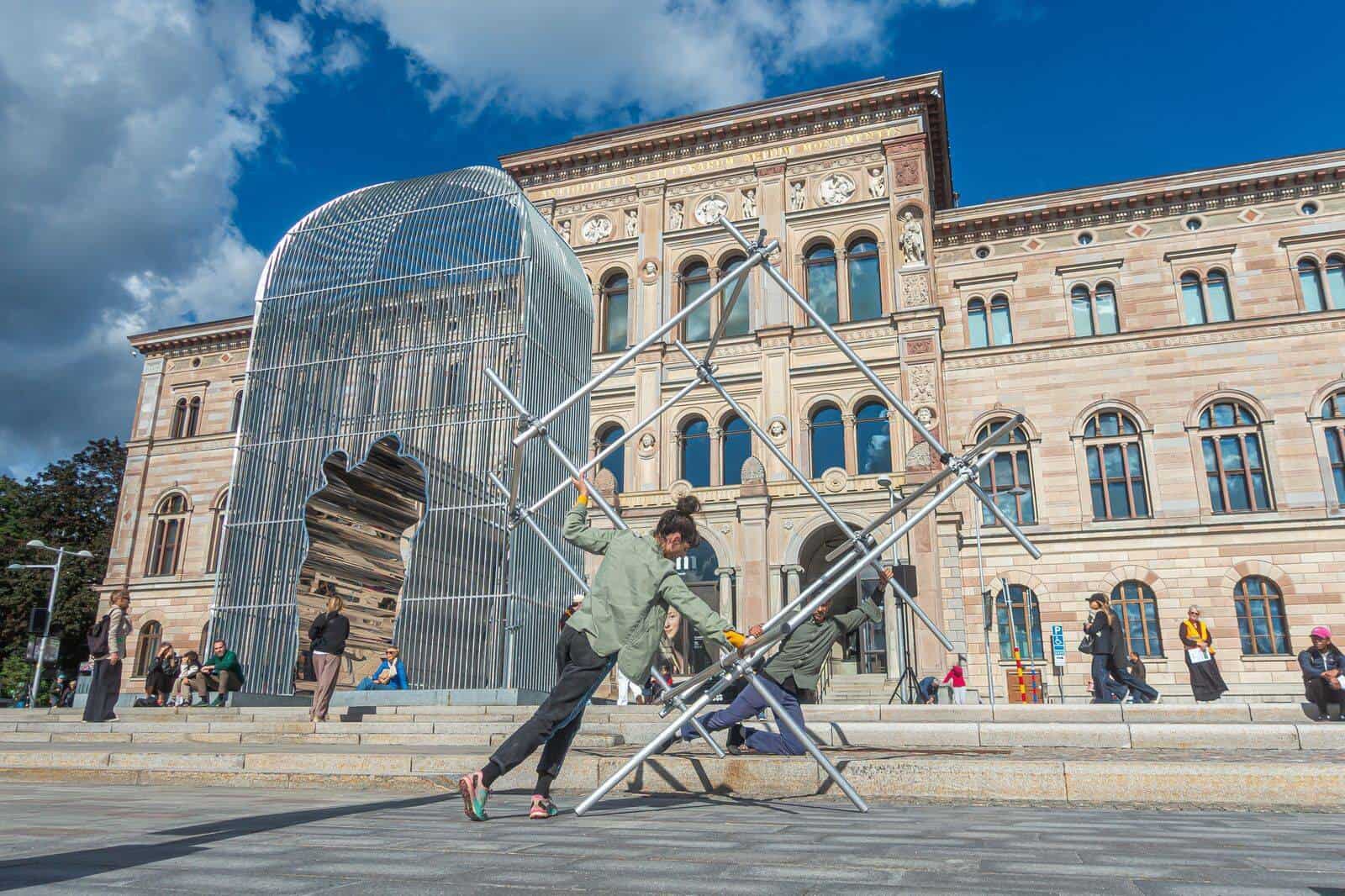 No domingo, dia 16, às 15h30, Brasil e Suécia se encontram em “Moving Landscapes”, da premiada companhia QUARTO, formada por Leandro Zapalla e por Anna af Sillén de Mesquita. A peça é uma instalação performativa e site-specific que investiga a relação entre corpos, território e ecologia. O ato utiliza um cubo metálico e plástico, e cria coreografias que exploram o vazio e o espaço habitável. A obra dialoga com o Construtivismo Russo e a estética de Hélio Oiticica, vendo o cubo como uma arquitetura comunitária, transitória e em constante reinvenção, inspirada pela lógica das favelas.