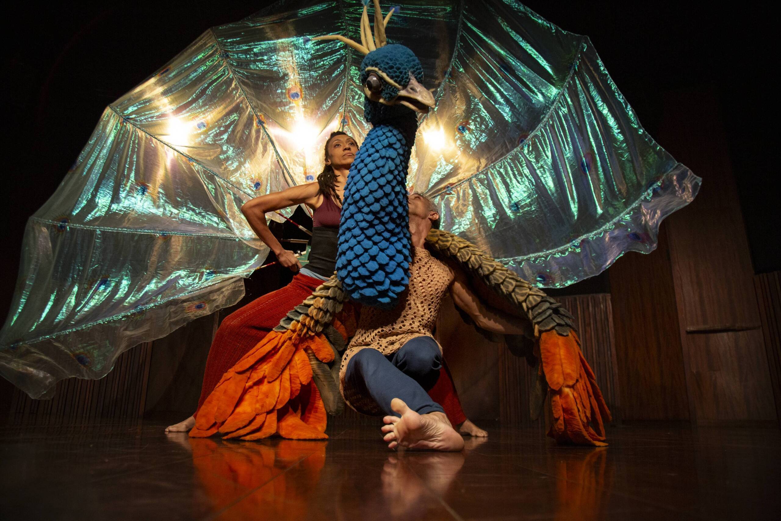 Em cena, os intérpretes e um boneco de pavão estabelecem jogos cênicos e de movimento por meio dos quais a narrativa é contada, propondo um labirinto narrativo no qual diferentes tempos convergem e no qual saltamos de uma camada de realidade para a outra, convidando o público a decifrar as narrativas e construir a história por meio do jogo cênico e de improvisos.
