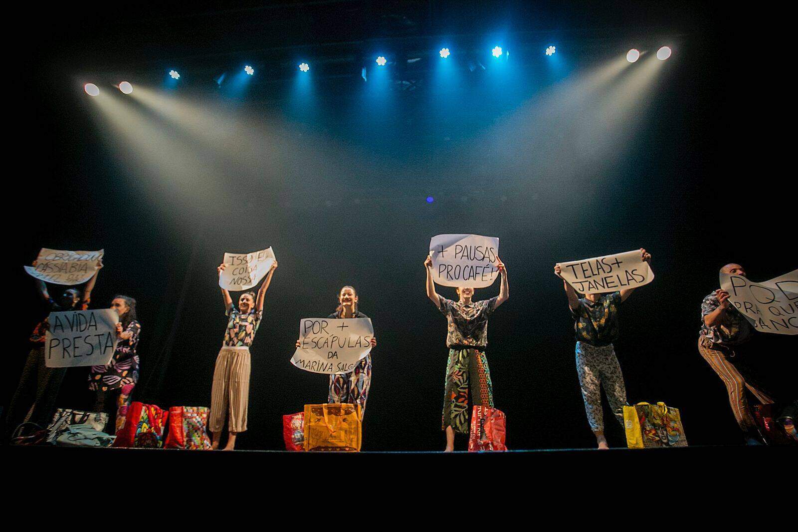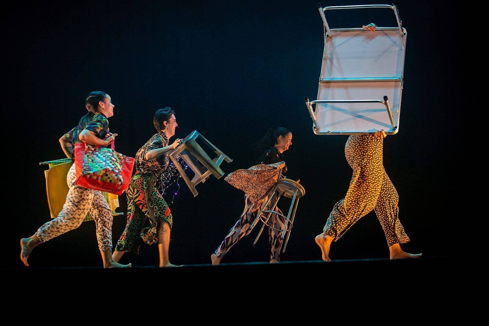 Há também, mudando-se o clima, a entrada do único bailarino pela plateia, com uma caixa de som, fazendo algumas referências à dança do passinho. Logo em seguida, as bailarinas entram com bancos, cadeiras de praia e luzes. Tudo parece exagerado, flerta com o brega, mas é usado em uma composição divertida, brincando-se com as cadeiras, com o rebolado e uma dinâmica da coreografia elaborada sem afetação. A obra se encerra nos lembrando que é preciso andar com fé.